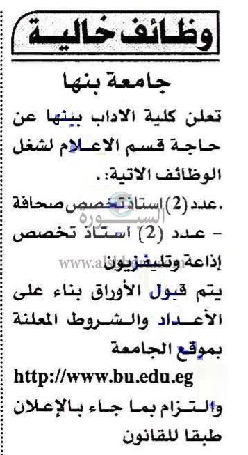 تعلن جامعة بنها عن وظائف جديدة لأعضاء هيئة التدريس "من حملة الماجستير والدكتوراه" وذلك وفقا لنص الإعلان التالي:-