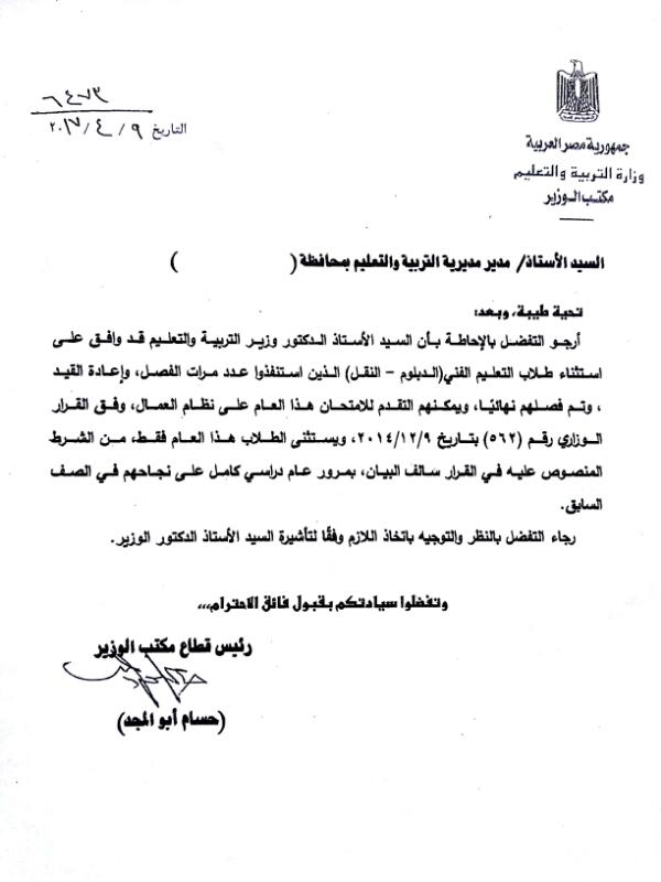 ارسلت وزارة التربية والتعليم خطابا يفيد بموافقة الدكتور طارق شوقى، وزير التربية والتعليم والتعليم الفنى، على استثناء طلاب الدبلومات الفنية الذين تم فصلهم لتجاوزهم نسب الغياب وأيضا عدد مرات إعادة القيد ويمكن دخولهم امتحاناتهم على نظام العمال وفق القرار رقم 562 لسنة 2014، ويستثنى الطلاب من الشرط سالف الذكر بمرور عام كامل على نجاحهم فى الصف السابق
