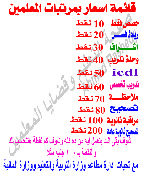 دشن نشطاء التعليم على موقع التواصل الاجتماعى "فيسبوك" قائمة بأسعار مرتبات المعلمين، حيث تم احتساب كل ما يقوم به المعلم بنظان النقاط التى اقترحها الدكتور طارق شوقى وزير التربية والتعليم والتعليم الفنى بزيادة رواتب المعلمين، والتى جاءت كالتالى: