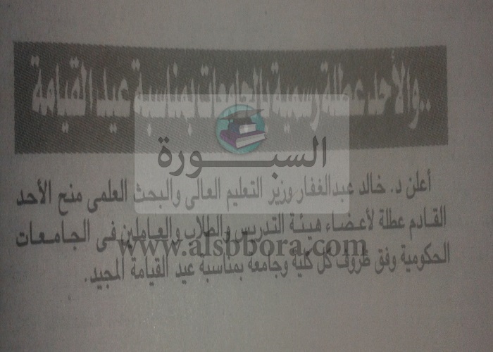 أعلن الدكتور خالد عبدالغفار وزير التعليم العالى والبحث العلمى منح الأحد المقبل عطلة لأعضاء هيئة التدريس والطلاب والعاملين فى الجامعات الحكومية وفق ظروف كل كلية وجامعة بمناسبة عيد القيامة المجيد.