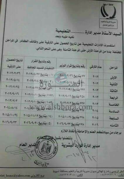 أعلنت مديرية التربية والتعليم بمحافظة اسيوط عن أحقية المعلمين للترقى بتاريخ قرار الوزير وليس القرار التنفيذى للمحافظ، جاء ذلك بناء على استفسار الادارات التعليمية عن تاريخ الحصول على الترقية على وظائف الكادر فى المراحل المختلفة بدء من المرحلة الأولى حتى المرحلة الثامنة، والتى جاءت على النحو التالى: