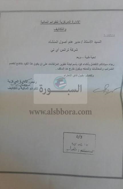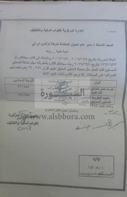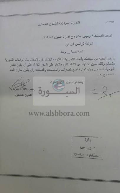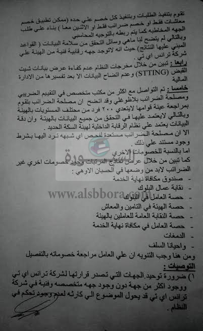 وسردت المذكرة عددا من الملاحظات، أبرزها أن العامل يقوم بالتوقيع على مرتبه من خلال "دفتر استلام" دون وجود شيت تفصيلى للراتب، كما تبين عدم وجود تسويات ضريبية فى نهاية العام، تبين للعامل الفروق الضريبية، بالاضافة إلى مخاطبة عدد من جهات الهيئة لشركة "تراتس اى تى" لانشاء اكواد غامضة للضرائب، ما يتطلب معرفة وسائل التحقق من سلامة الخصومات فى ظل عدم وجود جهة رقابية على "ترانس أى تى".