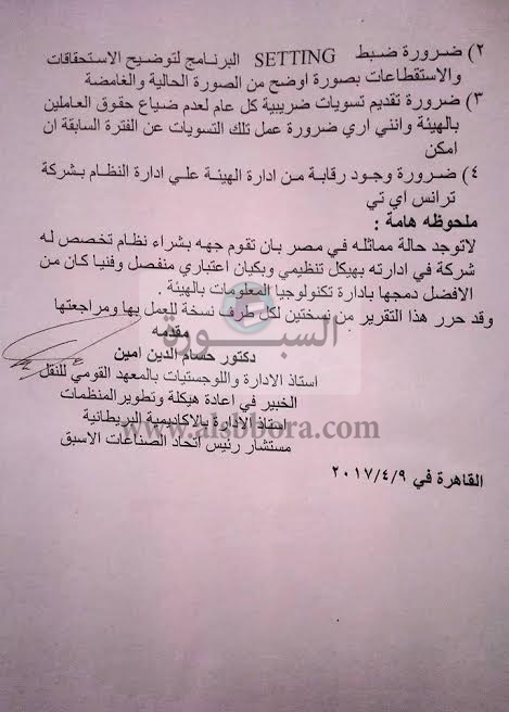 وأوصت المذكرة بتوحيد الجهات التى تصدر قراراتها لشركة "ترانس اى تى" فى ظل وجود أكثر من جهة فنية بالشركة، ما قد يحول الموضوع إلى كارثة لعدم التحكم فى النظام.
