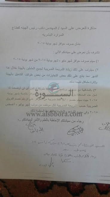 وأكد "حسام الدين"، فى مذكرته إنه بالتواصل مع مكتب متخصص في التقييم الضريبى، اتضح أن مصلحة الضرائب تراجع عينة لا تتعدى 200 فرد من مختلف المستويات بالهيئة، كما تبين من عرض نماذج المرتبات وجود خصومات اخرى غير الضرائب، خاصة بصندوق مكافأة نهاية الخدمة، ونقابة عمال البلوك، وحصة النقابة العامة للعاملين بالهيئة والدمغات والسلف.