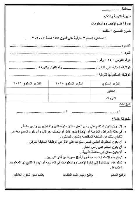 عاجل.. ننشر استمارة المعلم للترقية على قانون 155 لسنة 2007
