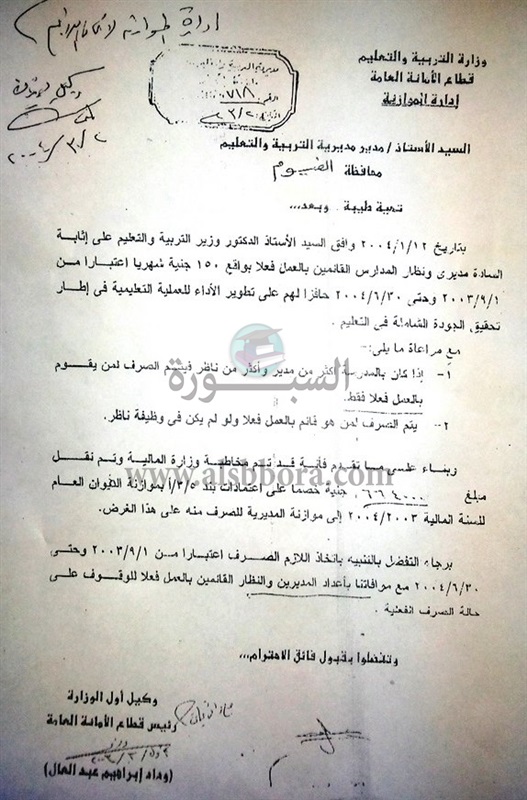 وواصل "وهذا ما تم بناءً عليه مخاطبة المديريات ومنها الإدارات التعليمية للتنفيذ في ذلك الوقت، وتم بناءً عليه وهو ما تم ذكره انه تم مخاطبة وزارة المالية وتم نقل مبلغ 664000 جنيها خصماً على اعتمادات بند 3/5/أ بموازنة الديوان العام للسنة المالية 2004/2003 الى موازنة المديرية للصرف منه على هذا الغرض وبعد ذلك وصل خطاب لاستمرارية الصرف".