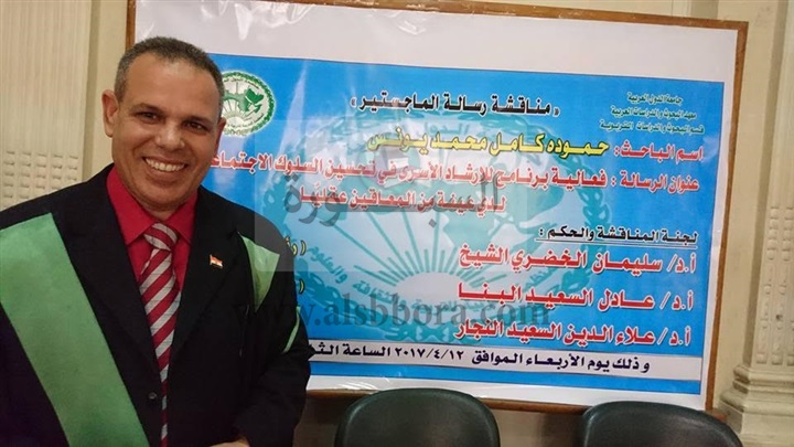 ناقش الباحث حمودة كامل محمد يونس مسئول الإتحادات الطلابية بمديرية التربية والتعليم بكفرالشيخ رسالة الماجستير والتى تناقش فى بحثها موضوع " فاعلية برنامج للإرشاد الأسرى فى تحسين السلوك الإجتماعى لدى عينة من المعاقين عقلياً " وذلك بمعهد البحوث والدراسات العربية بجامعة الدول العربية.