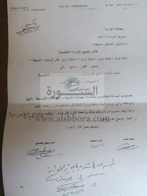 ارسلت ادارة شئون العاملين بمديرية التربية والتعليم فاكس لجميع الادرات التعليمية بمحافظة الغربية ، بخصوص المتعاقدين بالمكافاة الكاملة" العليا، المتوسطة، فوق المتوسط" والتى وافقت وزارة المالية على تثبيتهم على درجات دائمة، بضرورة ارسال مندوب من اداراتهم وذلك لمراجعة القرار قبل صدورة وذلك يوم الخميس الموافق20ابريل2017.