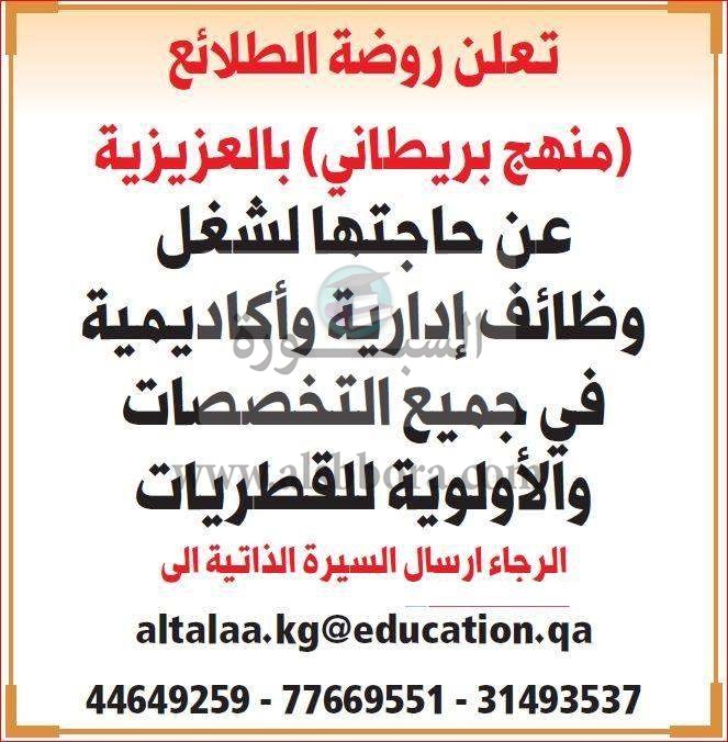 تعلن روضة الطلائع في دولة قطر ( منهج بريطــــاني ) بالعزيزية عن حاجتها لشغل مجموعة وظائف إدارية وأكاديمية في جميع التخصصات، وعلى الراغبين فى التقدم ارسال السيرة الذاتية عبر الايميل المنشور فى الاعلان التالى: