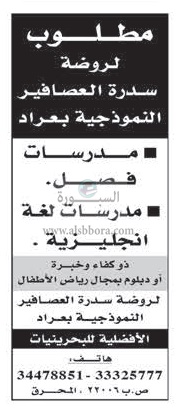 تعلن مدارس روضة سدرة العصافير النموذجية باللملكة البحرينية عن حاجتها الى معلمات، وعلى الراغبين فى التقدم ارسال السيرة الذاتية عبر الايميل المنشور فى الاعلان التالى: