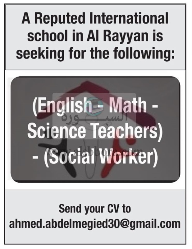 تعلن مدرسة دولية فى منطقة الريان بدولة قطر عن حاجتها الى معلمين، وعلى الراغبين فى التقدم ارسال السيرة الذاتية عبر الايميل المنشور فى الاعلان التالى: