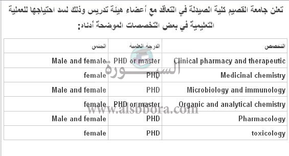 تعلن جامعة القصيم بالسعودية عن وظائف جديدة لأعضاء هيئة التدريس "من حملة الماجستير والدكتوراه" وفقا لنص الإعلان التالي:-