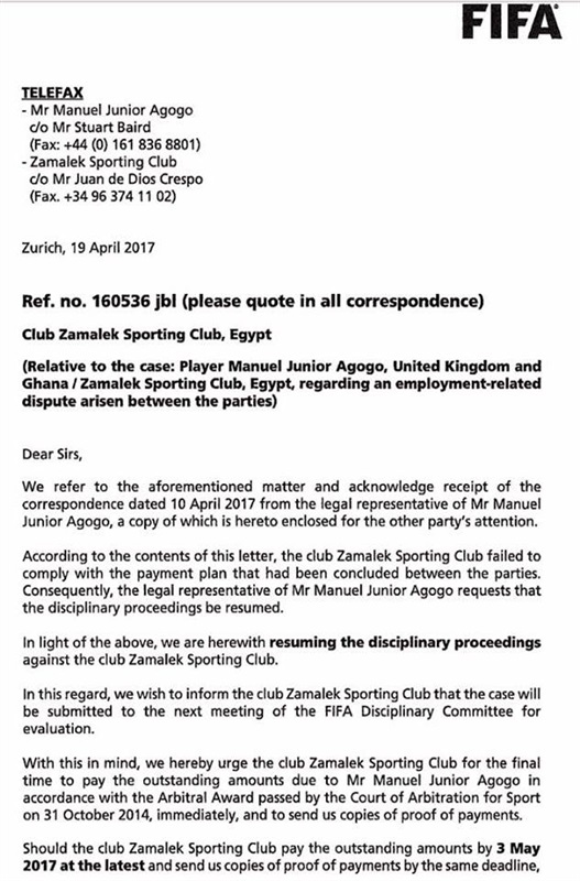 وأمهل خطاب الفيفا، نادي الزمالك حتى 3 من مايو المقبل، لموافاته بما يفيد سداد مستحقات اللاعب الغاني.