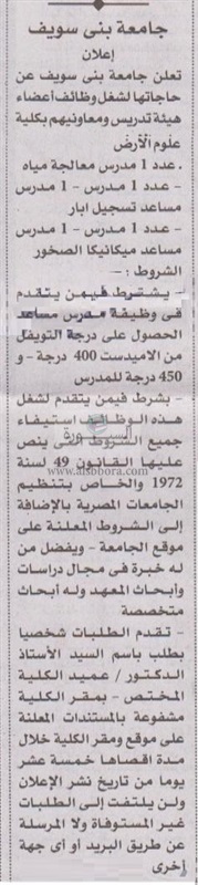 أعلنت جامعة بني سويف عن وظائف جديدة لأعضاء هيئة التدريس "من حملة الماجستير والدكتوراه" علما بأن أخر موعد للتقديم 30 ابريل وذلك وفقا لنص الإعلان التالي:-