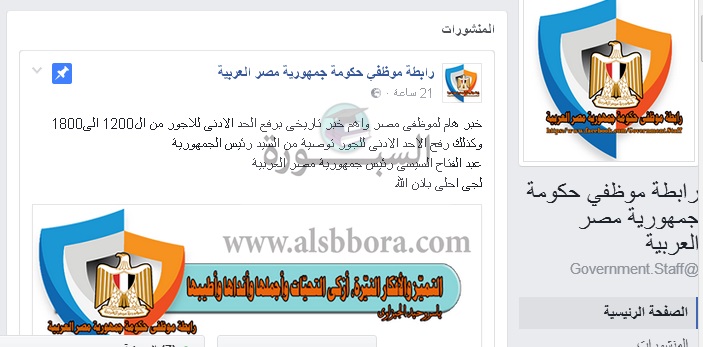 نشرت صفحة رابطة موظفي حكومة جمهورية مصر العربية علي موقع التواصل الاجتماعي "فيس بوك" خبر برفع الحد الأدنى للعاملين بالدولة من 1200 إلي 1800 جنيه .