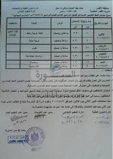 وتبدأ امتحانات الصف الرابع والخامس الابتدائى يوم الاثنين 24 أبريل وتنتهى يوم 30 أبريل ،حيث تبدأ الامتحانات فى تمام الساعة الثامنة صباحا للفترة الصباحية، والساعة الواحدة ظهرا لامتحانات الفترة المسائية، وإيضا تبدأ امتحانات الصف الأول والثانى الإعدادى اعتبارا من يوم 24 أبريل وحتى 30 أبريل طبقا لجدول الامتحانات.
