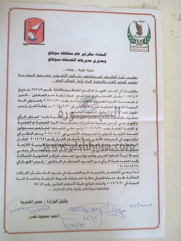 ينشر موقع "السبورة" كتاب مديرية التنظيم والادارة بمحافظة سوهاج إلى سكرتير عام محافظة سوهاج بشأن أحقية من تم ضم مدة خدمه له عسكرية او عامة او خبرة علمية او خبرة عملية ترتب عليها استيفائه المدة البينية اللازمة للترقية في ٢٠١٦/٦/٣٠ في استحقاق الترقية في ٢٠١٦/٧/١ والمؤرخ في 12-4-2017م.