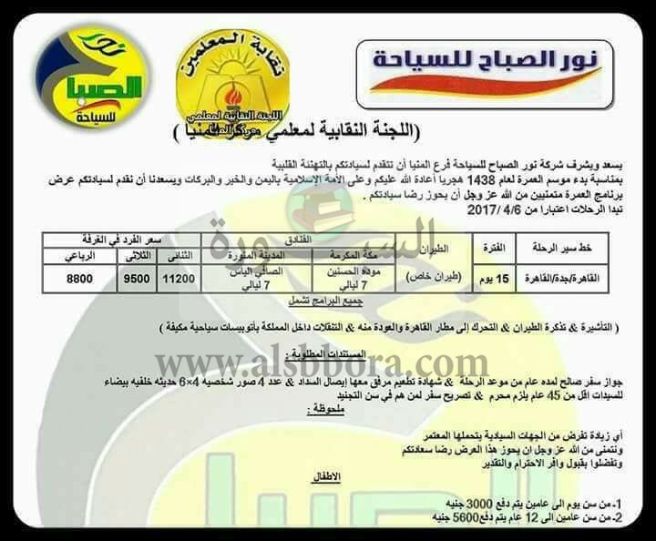 أعلنت اللجنة النقابية لمعلمي مركز المنيا عن عمرة شهر رمضان الكريم ولمدة ٣٥ يوما بحيث يكون السفر يوم ٢٨ شعبان والعودة بمشيئة الله تعالى يوم ٥ شوال وختام القرآن الكريم بمكة المكرمة.