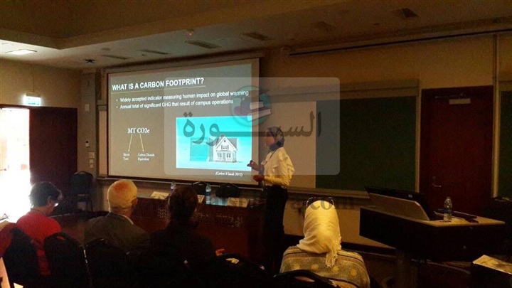 على مدار اليوم شارك أعضاء الجامعة في إجراء استبيان قصير لمبادرة استخدام أتوبيس الجامعة بدلا من السيارات للحفاظ على البيئة. كما أتيحت الفرصة لمجتمع الجامعة لمعرفة المزيد عن البصمة الكربونية للجامعة في ندوة بعنوان، "تتبع تأثير الجامعة الأمريكية بالقاهرة على المناخ: خمس سنوات من البيانات". قام خالد طرابية، أستاذ مساعد في التصميم المستدام في قسم العمارة والمؤلف المشارك لتقرير البصمة الكربونية للجامعة، بإدارة ندوة عن تغير المناخ في مصر ودور الجامعة. وضمت الندوة حسن الفوال عميد كلية العلوم والهندسة، وصلاح الحجار، رئيس قسم الهندسة الميكانيكية والأستاذ المساعد في مركز البحوث الاجتماعية. و هانيا شلقامي، أستاذ مشارك في مركز البحوث الاجتماعية بالجامعة.