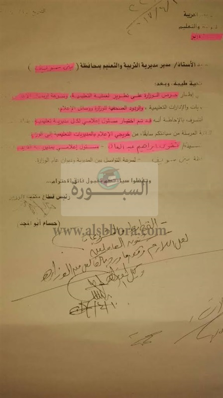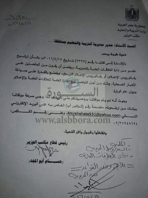حصل "السبورة "على فاكس من وزارة التربية والتعليم تخاطب به مديرية التعليم ببني سويف بشأن ترشيح مسئول إعلامي لها بالمديرية بشرط أن يكون حاصل على بكالوريوس إعلام ويتمتع بالقدرة على صياغة الأخبار الصحفية وذلك للتواصل مع الإدارة العامة للعلاقات العامة والإعلام بديوان عام الوزارة .