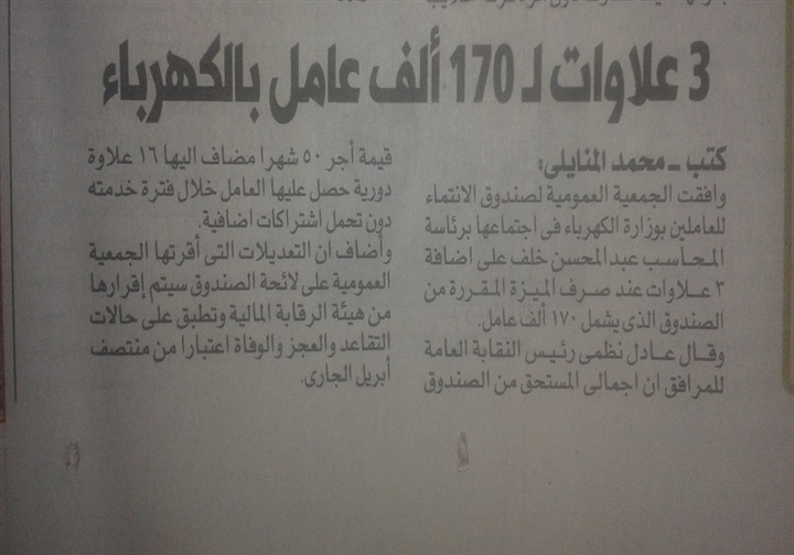 وافقت الجمعية العمومية لصندوق الانتماء للعاملين بوزارة الكهرباء فى اجتماعها برئاسة المحاسب عبدالمحسن خلف على اضافة 3 علاوات عند صرف الميزة المقررة من الصندوق الذى يشمل 170 ألف عامل.