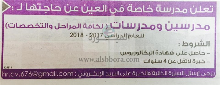 تعلن مدارس العين الإماراتية عن وظائف جديدة للمعلمين والمعلمات في جيمع المواد والمراحل التعليمية وذلك وفقا لنص الإعلان التالي:-