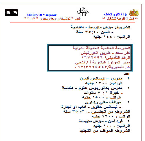 اعلنت المدرسة العالمية الحديثة الدولية عن حاجتها لشغل عدد من اعضاء هيئة التدريس للعام الدراسى القادم 2017 / 2018 وفقا للاعلان الرسمى المنشور بالنشرة القومية للتشغيل ، الصادرة عن وزارة القوى العاملة على ان يكون التقدم للوظائف بتقديم الاوراق المطلوبة للمدرسة وفقا للاعلان والتخصصات التالية :