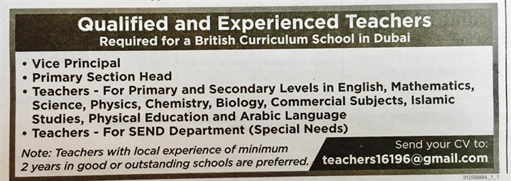 تعلن مدرسة خاصة في دولة الإمارات عن حاجتها للتعاقد مع معلمين ومعلمات في جميع المراحل التعليمية في المواد الواردة في الإعلان التالي:-