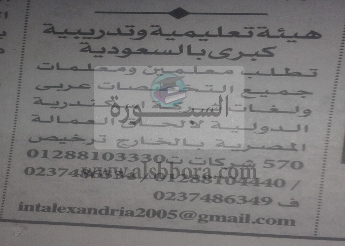 تعلن هيئة تعليمية وتدريبية كبرى بالمملكة العربية السعودية عن حاجتها الى معلمين ومعلمات، وعلى الراغبين فى التقدم ارسال السيرة الذاتية عبر الايميل المنشور فى اعلان جريدة الاهرام اليوم الجمعة الموافق 28 أبريل 2017.