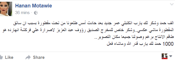 وكتبت حنان عبر حسابها بموقع التواصل الإجتماعى "فيس بوك" :"الف حمد وشكر لك يارب اتكتبلي عمر جديد بعد حادث أمس طلعونا من تحت مقطورة بسبب أن سائق المقطورة ماشي عكسي".