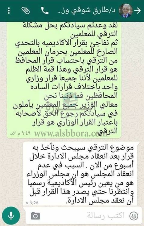 وكان الدكتور طارق شوقى قد وعد المعلمين من خلال مراسلتهم عبر وسيلة الاتصال "الواتس أب" بمناقشة ذلك الموضوع وايجاد حل نهائى له، واعطاء كل ذى حقا حقه، خاصة وأنهم غير مذنبين لتباين القرارات بين الوزير فى ذلك الوقت والقرار التنفيذى للمحافظين.