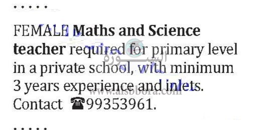 تعلن عدد من المدارس الخاصة في سلطنة عمان عن حاجتها للتعاقد مع معلمين ومعلمات وذلك وفقا لنص الإعلان التالي:-
