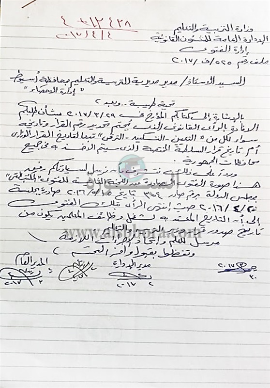 أصدت "ادارة الفتوى" بوزارة التربية والتعليم الى مدير مديرية التربية والتعليم فتوى من مجلس الدولة بشأن تعيين المعلمين وتسكينهم وترقيتهم واحتساب تاريخ قرار الوزير وليس القرار التنفيذى للمحافظ.