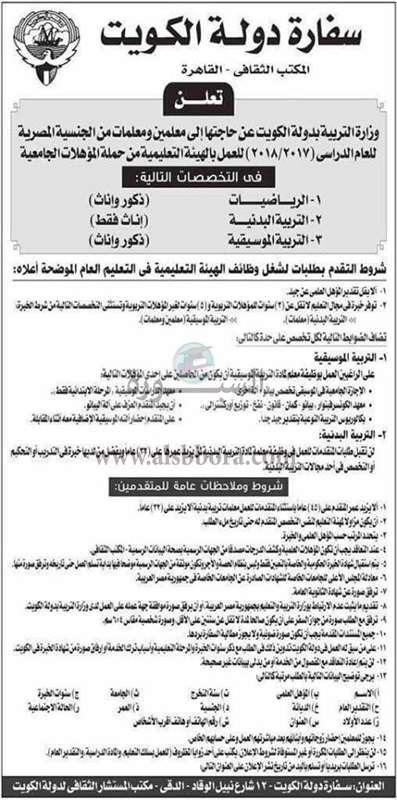 اعلنت سفارة الكويت بالقاهرة عن حاجة وزارة التربية الكويتية عن حاجتها الى معلمين ومعلمات ووفقا للاعلان التالى