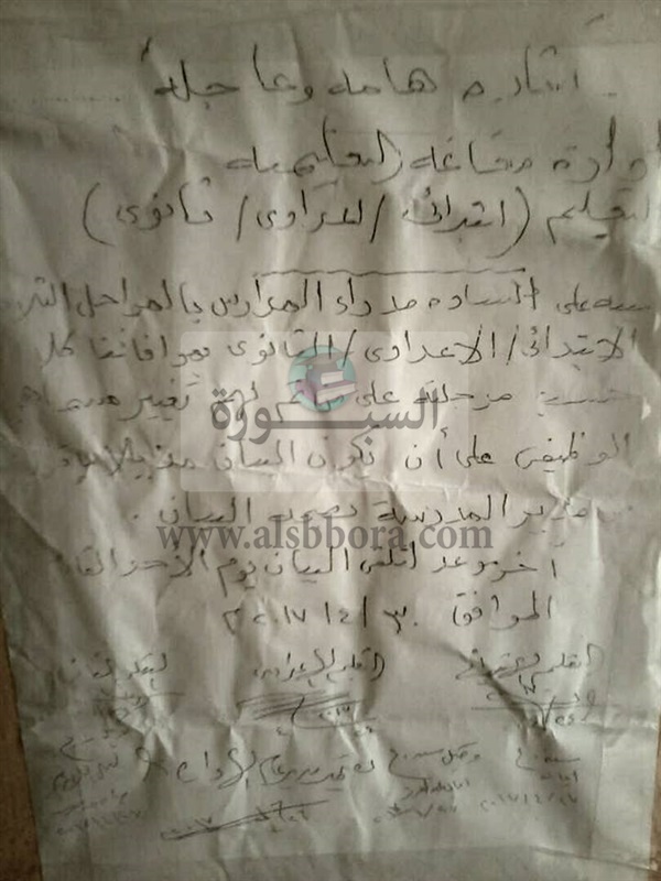 نبهت ادارة مغاغة التعليمية على مدراء المدارس بالمراحل الثلاثة "ابتدائى - اعدادى - ثانوى" بموافاتنا كلا حسب مرحلته على من تم لهم تغيير مسماهم الوظيفى على ان يكوم البيان مذيلا باقرار مدير المدرسة بصحة البيان.