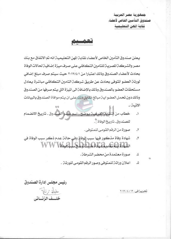 أعلن صندوق التأمين الخاص لأعضاء نقابة المهن التعليمية انه تم الاتفاق مع بنك مصر والشركة المصرية للتأمين التكافلى على صرف ميزة اضافية لحالات الوقاة بحادث لاعضاء الصندوق وذلك اعتبارا من أول أبريل 2017، حيث يتم صرف مبلغ اضافى لوثة العضو المتوفى بحادث عن طريق شركة التأمين التكافلى مباشرة يعادل مستحقات العضو بالصندوق.