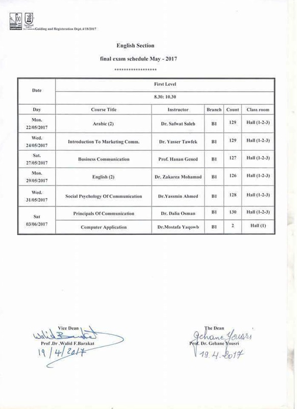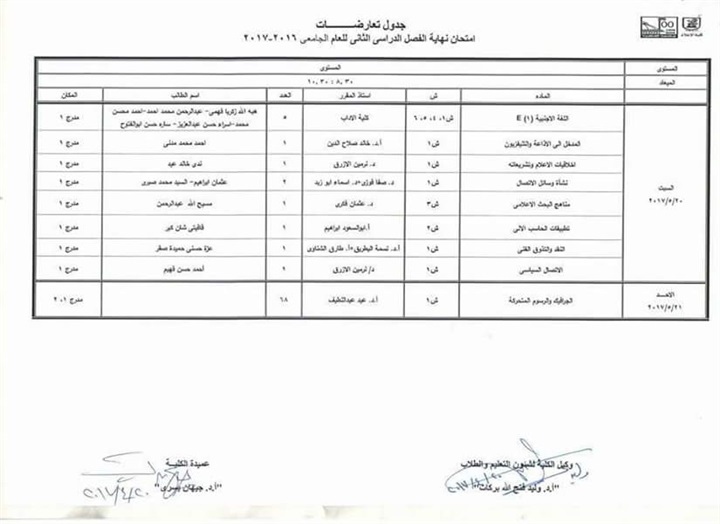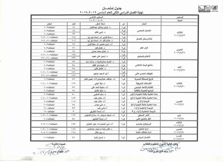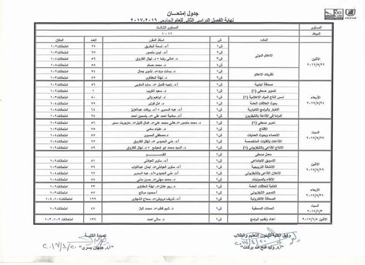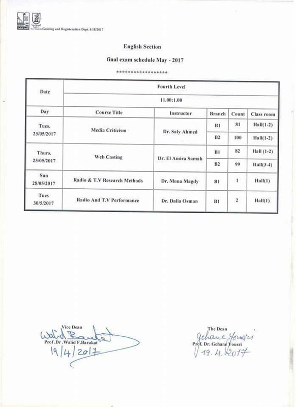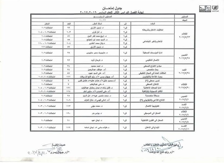 اعلنت كلية الاعلام بجامعة القاهرة جدول امتحانات نهاية الفصل الدراسى الثانى 2017 بعد اعتمادة من الدكتورة جيهان يسري عميد كلية إعلام جامعة القاهرة، لكافة الفرق الدراسية بالكلية.