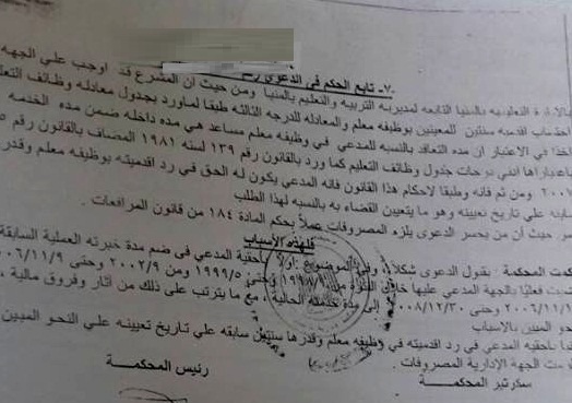 كان احد المعلمين قام برفع دعوى بالمحكمة الادارية بمحافظة المنيا ضد السيد وكيل وزارة التعليم بالمنيا والسيد محافظ المنيا للمطالبة بضم مدة الخبرة السابقة وقد حكمت المحكمة بأحقية المدعى فى ضم مده فترة التعاقد قبل المعلم المساعد، وكذلك احقية المدعى فى ضم ورد اقدميته لمدة سنتين على تاريخ تعيين معلم والزام الجهة الادارية برد المصروفات .