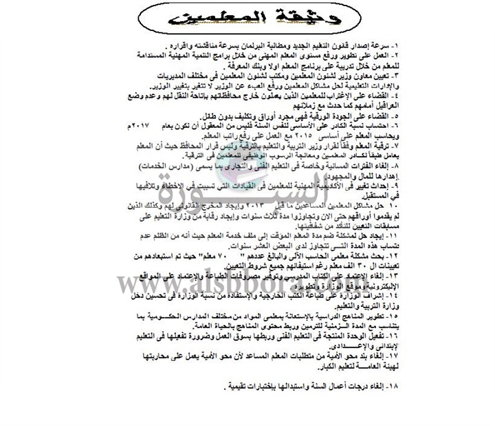 نشر نشطاء المعلمين وثيقة مطالبات تعددت الـ 17 طلبا يناشدون فيها وزارة التربية والتعليم بتلبية هذه المطالبات ، والتى جاءت على النحو التالى: