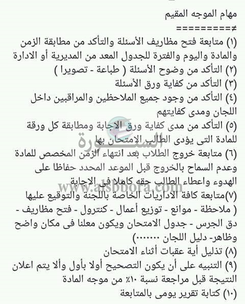 ينشر موقع السبورة أهم أعمال والواجبات المتبعة من قبل الموجه المقيم فى لجان الامتحانات والتى جاءت كالتالى: