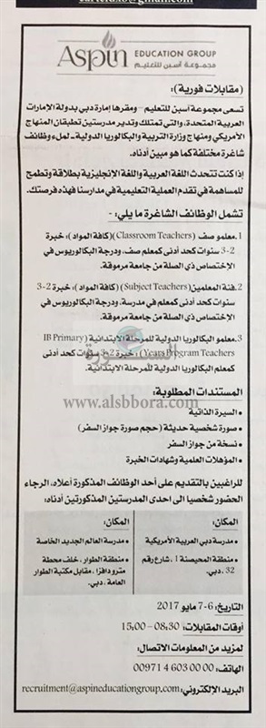تعلن مجموعة اسين للتعليم ومقرها امارة دبى بدولة الامارات العربية المتحدة عن حاجتها الى معلمين فى جميع التخصصات، وعلى الراغبين فى التقدم التواصل من خلال الايميل المنشور فى الاعلان التالى: