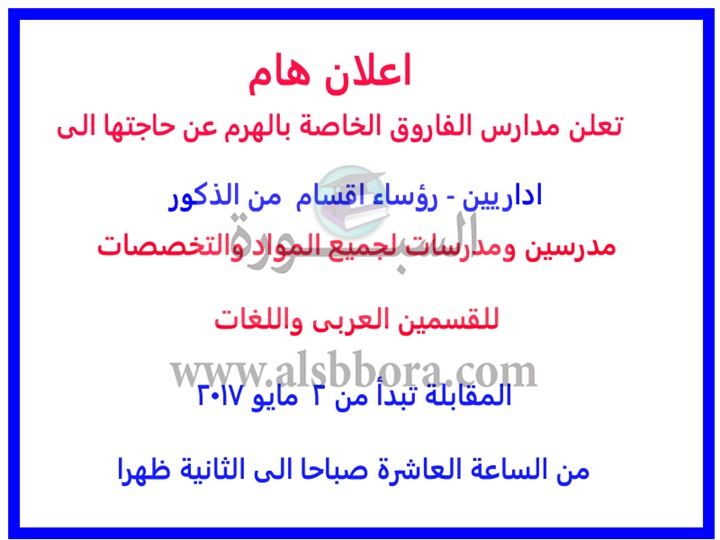 مدارس الفاروق الخاصة بالهرم تعلن عن حاجتها لمعلمين واداريين..ننشر نص الاعلان