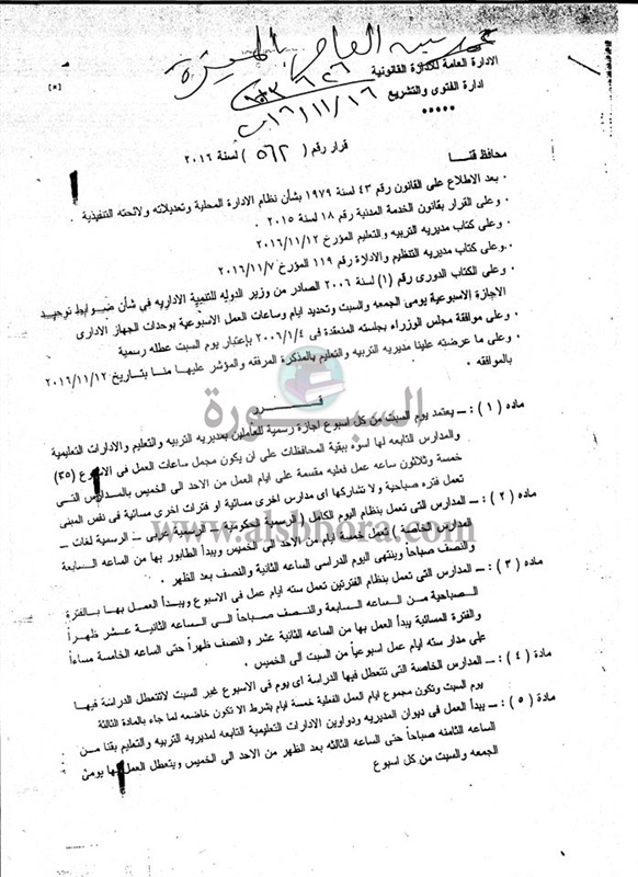 وأضاف "لا يستطيع وكيل الوزارة أو مدير الادارة إلغاء قرار المحافظ باعتبار يوم السبت إجازة رسمية ولكن في حالات استثنائية كالامتحانات علي سبيل المثال بيتم إلغاء إجازة يوم السبت ويعتبر يوم عمل يتقاضي عنه المعلم أجر إضافي وبعد اتنهاء الامتحانات يرجع الوضع لما كان عليه باعتبار يوم السبت اجازة رسمية".