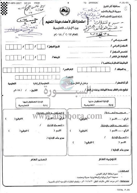 ينشر موقع "السبورة" طلب نقل بين الادارات التعليمية لأعضاء هيئة التعليم بمحافظة كفر الشيخ للعام الدراسي 2017-2018م