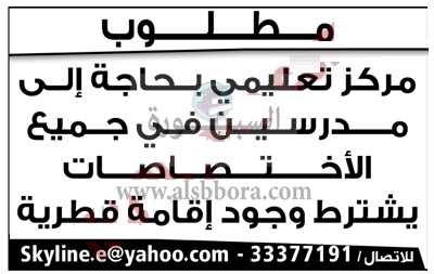 يعلن مركز تعليمي في دولة قطر عن وظائف جديدة للمعلمين ومعلمات في جميع المواد وفقا لنص الإعلان التالي:-