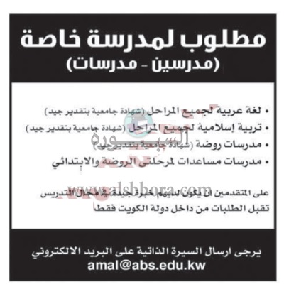 تعلن مدرسة خاصة في الكويت عن وظائف جديدة للمعلمين والمعلمات وذلك وفقا لنص الإعلان التالي: -