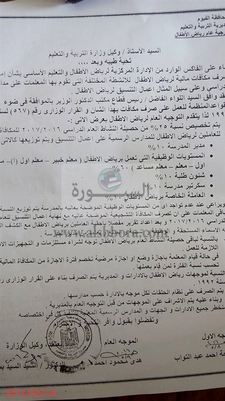 ينشر موقع السبورة الفاكس الوارد من الادارة المركزية لرياض الأطفال والتعليم الأساسى بشأن صرف مكافآت مالية لهذه الفئة من المعلمين.