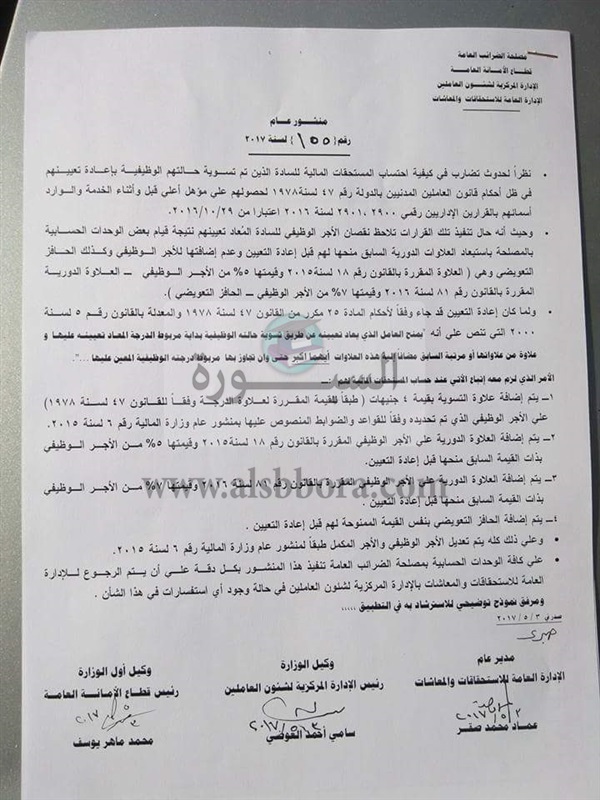 أن المنشور الجديدعقب تلاحظ نقصان أجرهم الوظيفى وعدم ضم العلاوات الدورية التى حصلوا