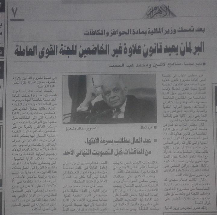 قرر مجلس النواب فى جلسته امس اعادة مشروع قانون علاوة غير الخاضعين لقانون الخدمة المدنية للجنة القوى العاملة لاعادة المناقشات مرة أخرى حول المادة الخامسة من القانون الخاص بصرف الحوافز والمكافآت والبدلات وجميع المزايا النقدية والعينية وذلك بعد اعتراض عمرو الجارحى وزير المالية على الغائها وتمسكه باعادتها مرة اخرى.