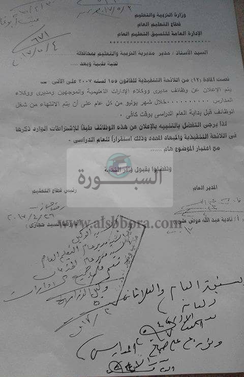 أرسلت وزارة التربية والتعليم الى مديرى المديريات خطابا بشأن الاعلان عن وظائف مديرى ووكلاء الادارات التعليمية والموجهين ومديرى ووكلاء المدارس خلال شهر يوليو من كل عام.